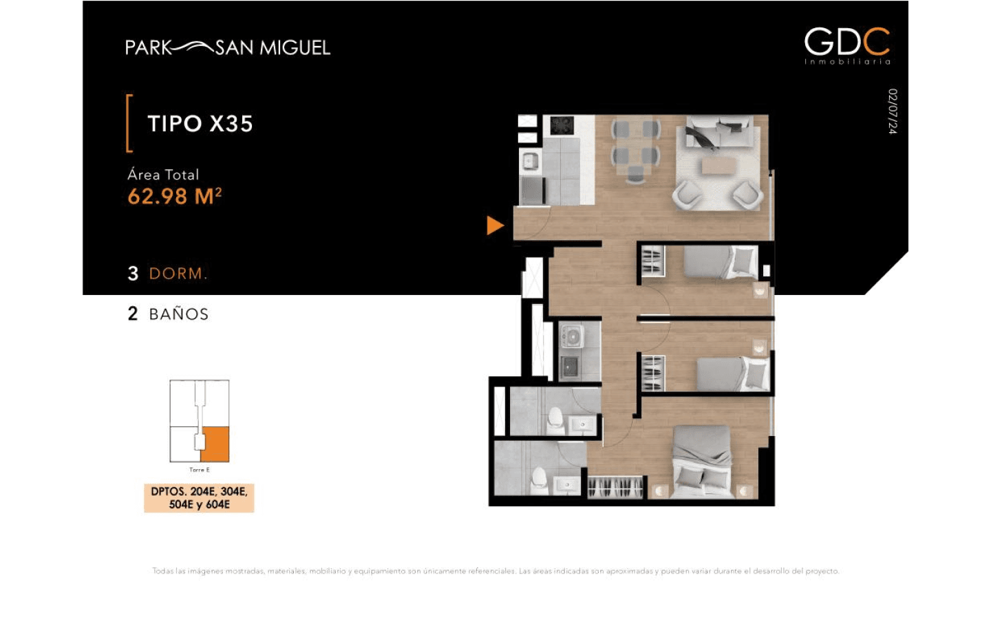 Cómodo departamento flat de 62.98 m² en el piso 2. Incluye 3 dormitorios y 2 baños, ideal para quienes buscan practicidad.
