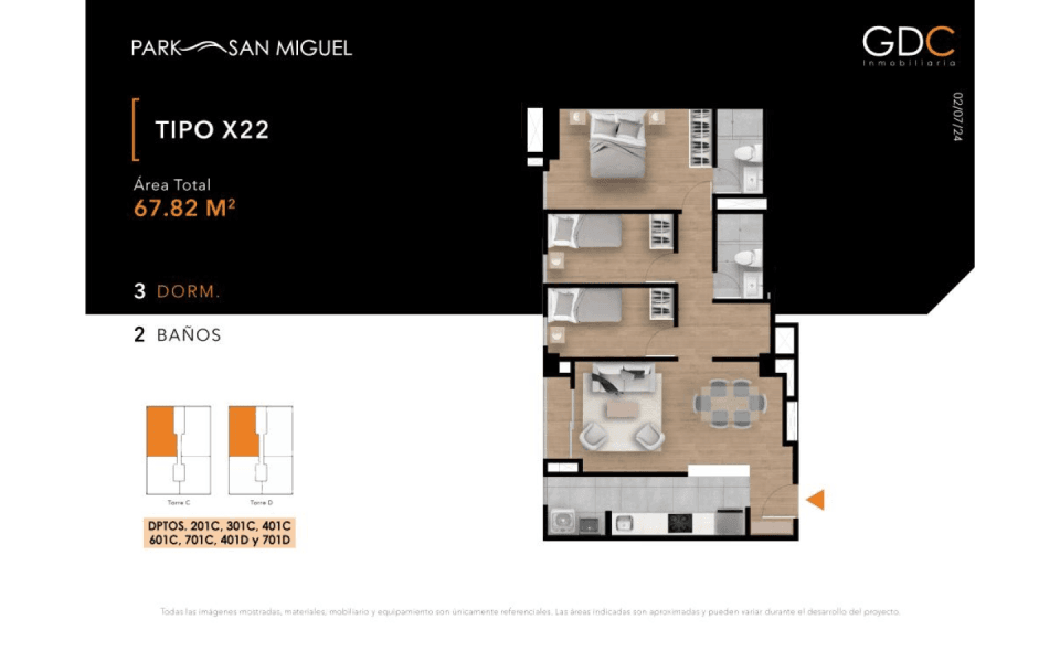 Acogedor departamento flat de 67.82 m² en el piso 7. Cuenta con 3 dormitorios y 2 baños, espacios cómodos e iluminados.