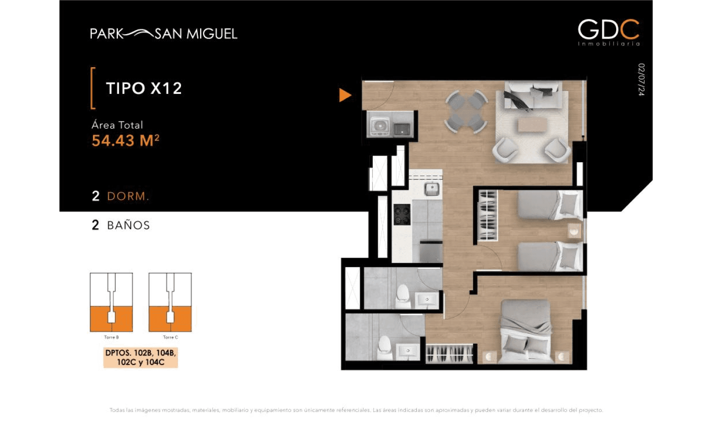 Acogedor departamento flat de 54.43 m² en el piso 1, con 2 dormitorios y 2 baños. Perfecto para parejas jóvenes o inversión.
